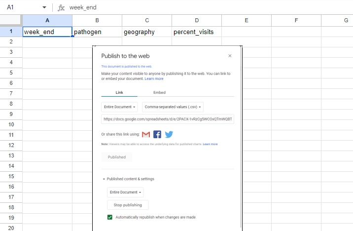 I setup a Google Sheet with the appropriate Headers, ready to receive incoming data. I also published to document so Tableau had the appropriate web address to update its visualizations automatically.