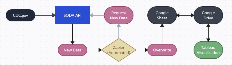 The basic steps to create a live visualization in Tableau Public requires Google Drive in addition to our data source. We know we need to request the data from data.CDC.gov, so we have to work with their API. We also know an automation service will be necessary to facilitate data transfer and scheduling.