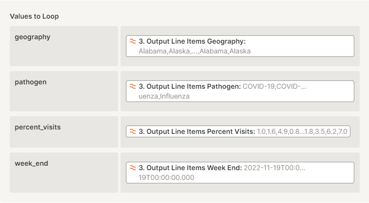 Here, I have limited the iterations of rows retrieval to 193 (the total rows for each weekly data dump, defined by pathogens + States & territories) and started the loop at “2” to prevent overwriting Headers. The Overwrite function will prevent any older data from corrupting our dataset.